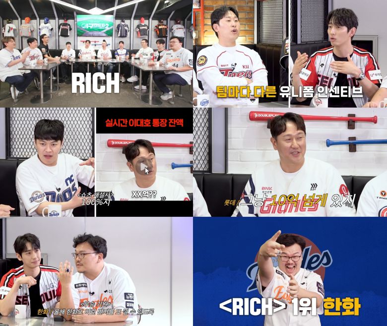 이날 방송에선 비행기 비즈니스석에 앉아 전지훈련을 간 KIA타이거즈를 비롯해 원정 경기 때마다 그룹사 호텔을 이용하는 롯데자이언츠, 휴대폰을 비롯해 각종 전자기기 제공 복지가 최상인 삼성라이온즈, 배포가 남다른 한 방을 보여줬던 LG트윈스 등 대표자들의 자기 구단의 'RICH' 자랑이 스튜디오의 분위기를 후끈 달아오르게 했다.