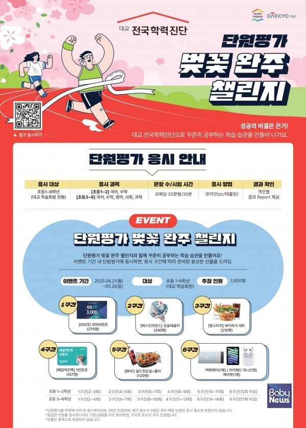 대교는 오는 5월 25일까지 전국 초등학생을 대상으로 '대교 전국학력진단’ 단원평가 완주 챌린지 이벤트를 실시한다고 22일 밝혔다.