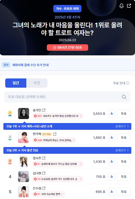 22일 오후 3시 32분 기준, 디시트렌드 '그녀의 노래가 내 마음을 울린다! 1위로 올려야 할 트로트 여자는?' 일간 투표에서 반가희는 1,692표를 얻으며 2위를 기록했다. 중견 가수로서의 무게감과 진정성 있는 무대는 지금도 많은 이들의 마음을 두드리고 있다.