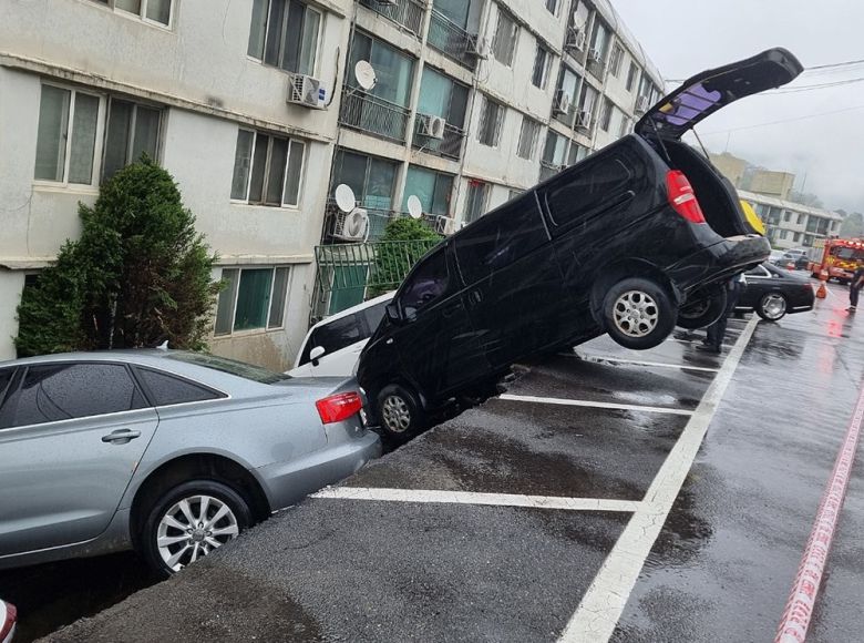 경기 남양주시의 한 아파트 지상 주차장 옹벽이 무너지며 차량 여러 대가 파손됐다.