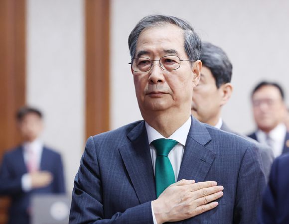 한덕수 대통령 권한대행 국무총리가 18일 정부서울청사에서 열린 국무회의에서 국기에 경례하고 있다. 2025.4.18 [대통령실통신사진기자단] [사진=연합뉴스] |