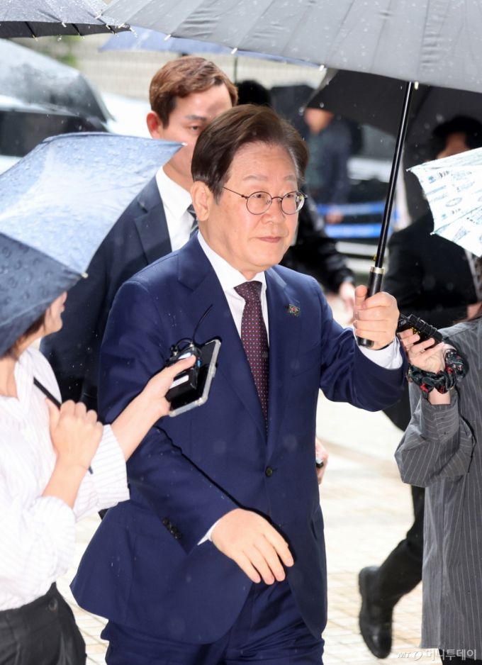 [서울=뉴시스] 김선웅 기자 = 이재명 제21대 대통령 선거 더불어민주당 경선 후보가 22일 서울 서초구 서울 서초구 서울중앙지법에서 열린 대장동 배임 및 성남FC 뇌물 의혹 사건 75차 공판에 출석하고 있다. 2025.04.22. mangusta@newsis.com /사진=김선웅