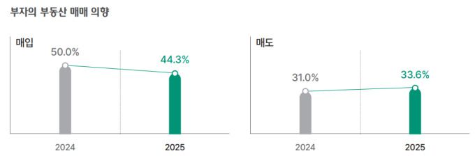 올해 '부동산 매입(매수) 의향이 있다'고 응답한 부자는 44%로, 2024년(50%)에 비해 줄었다. 이미 부동산을 보유한 이들의 부동산 추가 매입 의향은 42%로 평균보다 낮았고, 전년(49%)보다도 하락세를 드러냈다.