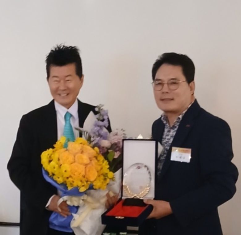 | ◇ 지난 21일 이태원 K212에서 열린 한국재능기부협회 홍보대사 위촉행사에서 최세규 이사장(사진 오른쪽)이 가수 태진아와 기념 촬영을 하고 있다. |