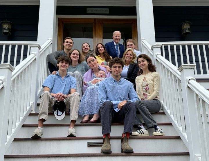 사진에서 배우자 질 바이든 전 영부인을 포함한 가족들은 델라웨어 자택 앞에 모여 앉았다. 바이든 전 대통령은 가장 뒤에서 환하게 미소 지었다.