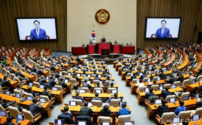 우원식 국회의장이 3일 서울 여의도 국회 본회의장에서 열린 제422회국회(임시회) 개회식에서 개회사를 하고 있다./ 사진=뉴스1 |