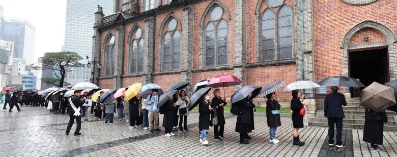 온종일 비가 오는 궂은 날씨도 추모 행렬을 막지 못했다. 지난 21일 선종한 프란치스코 교황의 공식 분향소가 설치된 한국 천주교 서울대교구 주교좌성당인 명동대성당.