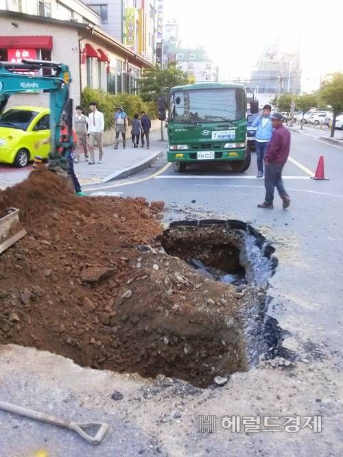 지난 2015년 5월 19일 순천시 조례동 한 도로에서 땅꺼짐 현상이 발생해 긴급 복구 작업이 진행되고 있다. /박대성 기자. |