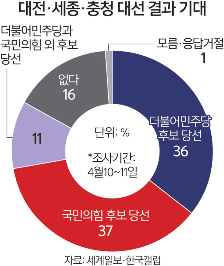 이번 대선에서도 이 같은 기류는 이어지고 있다. 세계일보가 10∼11일 한국갤럽을 통해 진행한 여론조사 결과, 대전·세종·충청 응답자의 정당 지지도는 더불어민주당(35%)과 국민의힘(35%)이 동일한 수준을 보였다. 3위는 ‘없다’가 16%를 차지했다.