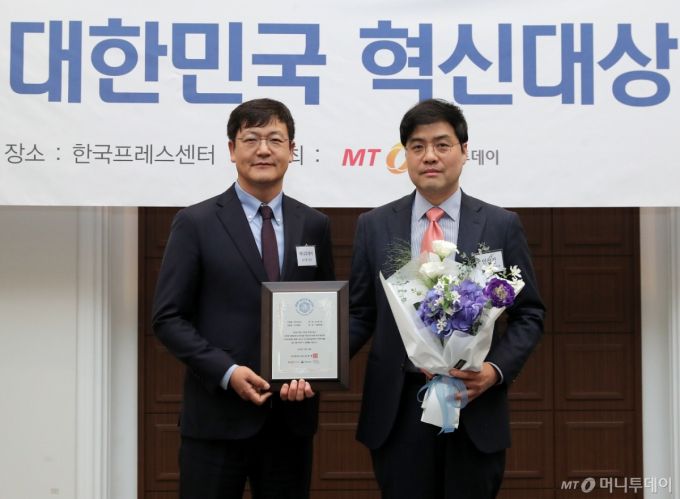인산가 김형석 경영지원본부장(오른쪽)이 '2025 대한민국 혁신대상' 수상 후 머니투데이 송기용 전무와 함께 기념 촬영을 하고 있다./사진=김창현 기자 |