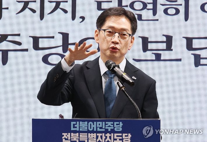 (전주=연합뉴스) 임채두 기자 = 더불어민주당 김경수 대선 경선 후보가 22일 민주당 전북도당에서 열린 당원 간담회에서 발언하고 있다. 2025.4.22 doo@yna.co.kr 연합뉴스 |