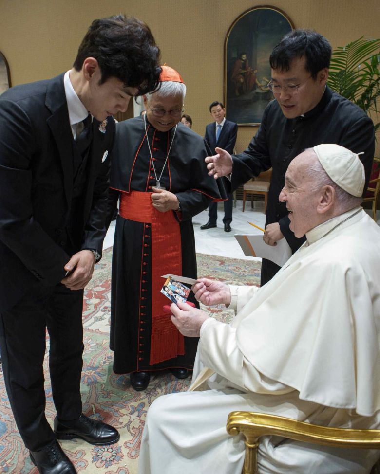 공개된 사진에는 김강우가 유흥식 라자로 추기경의 곁에서 프란치스코 교황을 알현하는 모습이 담겼다. 그의 가족 사진을 보고 환하게 미소짓는 프란치스코 교황의 모습이 시선을 모은다.