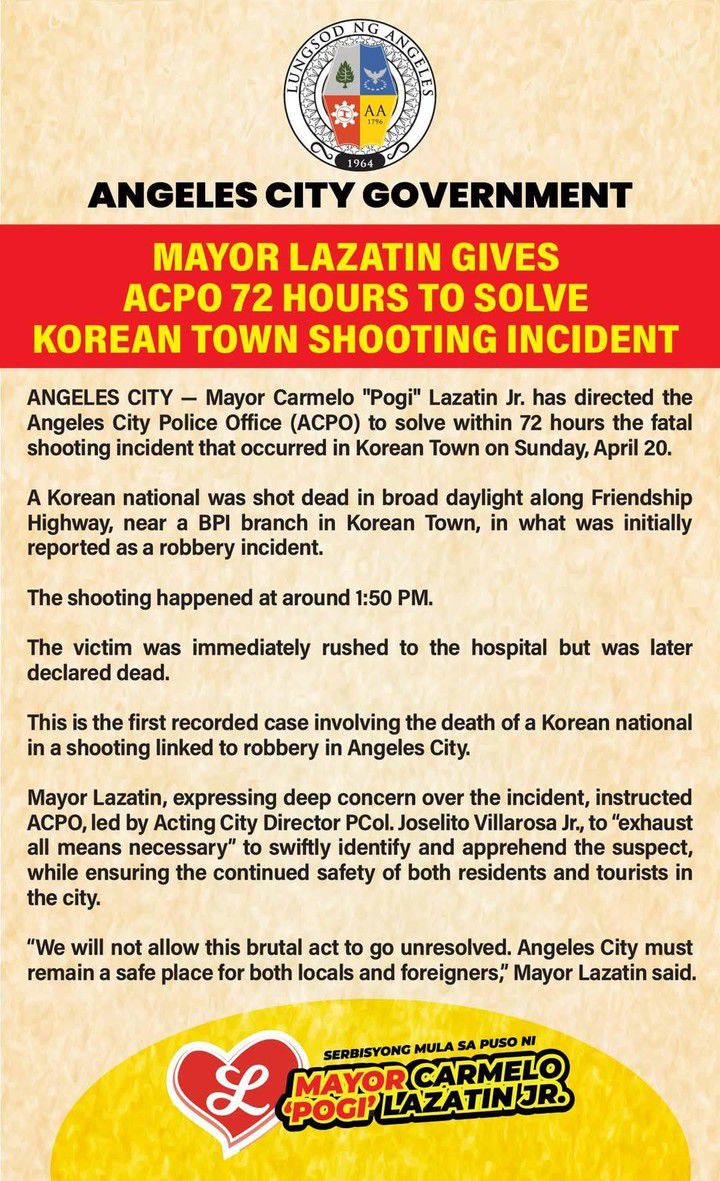 한편 카르멜로 라자틴 주니어 앙헬레스 시장은 지난 21일 "우리는 이 잔혹한 행위를 해결되지 않은 채 놔두지 않을 것이다. 앙헬레스시는 지역 주민과 외국인 모두에게 안전한 곳이어야 한다"며 해당 사건을 72시간 내로 해결하라고 경찰에 지시했다.