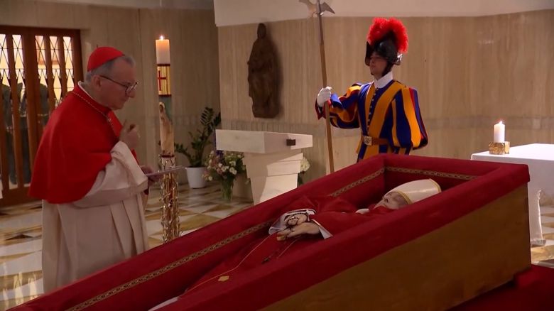 사진 속에서 교황은 바티칸 내 거처인 산타 마르타의 집 예배당에 있는 관에 붉은 예복을 입고 누워 있는 모습입니다.