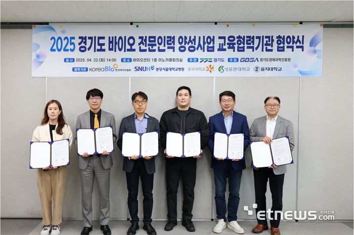 경과원은 지난 22일 광교 바이오센터에서 '2025년 경기도 바이오 전문인력 양성사업' 추진을 위해 한국바이오협회, 분당서울대병원, 성균관대, 동국대, 을지대 등 5개 기관과 업무협약을 체결했다고 23일 밝혔다.