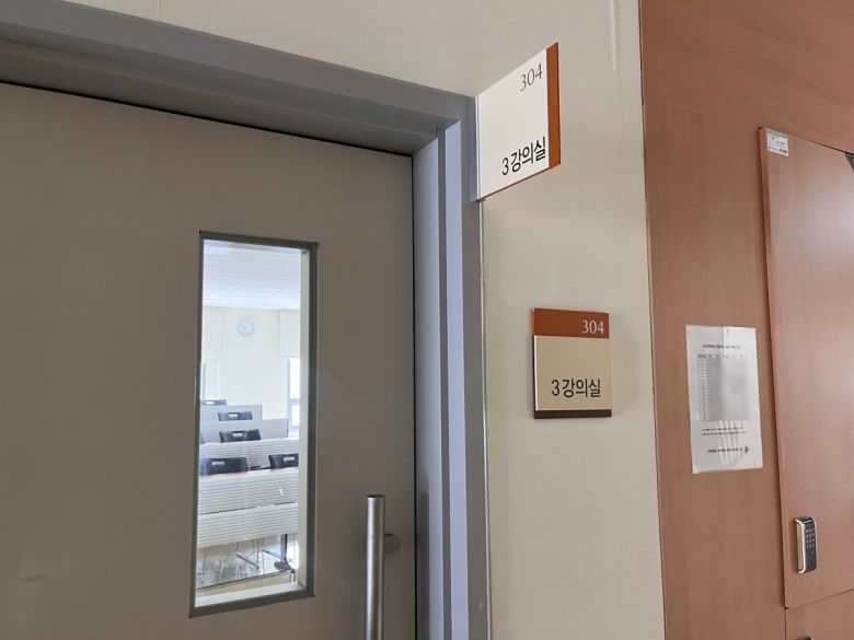 100여 명이 앉을 수 있는 강의실 문은 모두 굳게 잠겨 있었다. 강의실 옆 사물함 벽면에는 ‘2023학년도 사물함 배정 명단’이 붙어 있어 학생들이 오랜 시간 사용하지 않았다는 것을 짐작할 수 있었다.