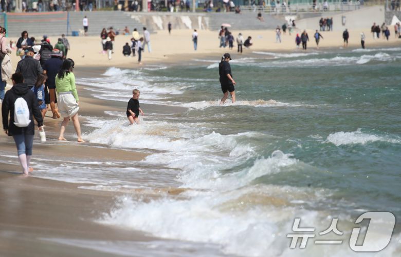 전국적으로 초여름 날씨를 보인 지난 21일 오후 부산 해운대해수욕장을 찾은 외국인 어린이가 물놀이를 즐기고 있다. 2025.4.21/뉴스1 ⓒ News1 윤일지 기자 |