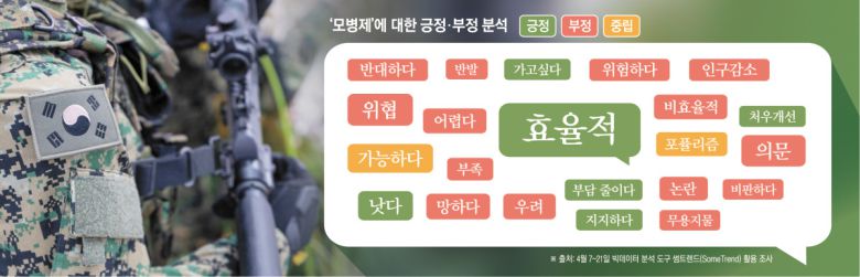 실제 모병제와 관련한 빅데이터의 긍정·부정 평가에서도 '반대하다', '어렵다, '부담', '망하다' 등의 부정적인 인식을 나타내는 단어들이 10위 안에 올라 있다. '효율적'이라는 단어가 긍정·부정 전체 평가에서 연관어 1위를 차지했지만 모병제의 효율에 의문을 던지는 반응이 적지 않은 만큼 긍정적인 반응으로만 해석하긴 어려울 것으로 보인다. 10~20위엔 '우려', '인구감소', '위험하다', '비판하다' 등이, 20위 밖엔 '위협', '논란', 지지하다', '합리적', '차별', '반발', '불만' 등 부정적인 감성을 나타내는 단어들이 적지 않은 비중을 차지했다.