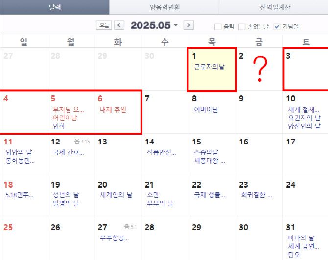 2025년 5월 달력. 네이버 달력 갈무리. |