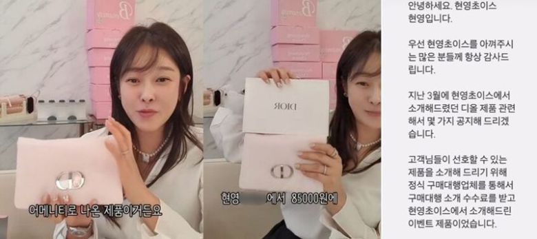 22일 현영은 자신의 SNS를 통해 "지난 3월에 현영초이스에서 소개해드렸던 디올 제품 관련해서 몇 가지 공지해 드리겠다"며 글을 올렸다.