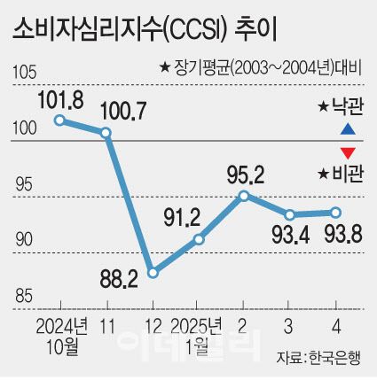 23일 한국은행이 발표한 ‘2025년 4월 소비자동향조사’에 따르면 3월 소비자심리지수(CCSI)는 93.8로 전월보다 0.4포인트 상승했다. 한 달 만에 상승 전환이다. 하지만 지난해 12월 비상계엄 사태 이후 5개월째 지수는 100선을 하회하고 있다.