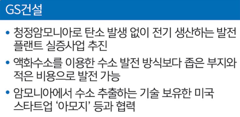 앞서 GS건설은 올해 1월 HD현대인프라코어, 아모지와 ‘청정수소화합물(암모니아) 기반 수소엔진 발전기’ 개발을 위한 전략적 기술협약을 맺은 바 있다. 아모지는 암모니아에서 수소를 추출하는 기술을 보유한 미국 스타트업이며, HD현대인프라코어는 수소를 연료로 전기를 만드는 엔진을 생산하는 기업이다.