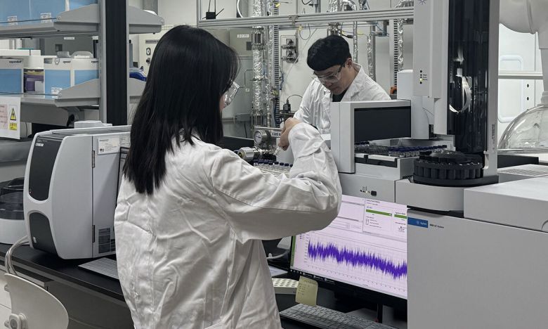 DL이앤씨의 탄소 포집·활용·저장(CCUS) 기술 전문 자회사 카본코 소속 연구원이 대전 대덕연구단지에 있는 카본코 기술연구소에서 이산화탄소 흡수제 성능 실험을 하고 있다. DL이앤씨 제공 |