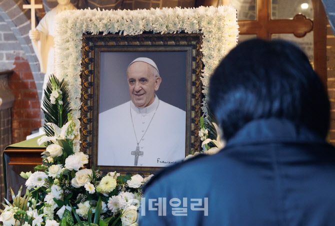 지난 21일(현지시간) 선종한 프란치스코 교황의 빈소가 마련된 22일 오후 서울 중구 명동대성당 지하성당에서 조문객들이 추모를 하고 있다.(사진=사진공동취재단) |