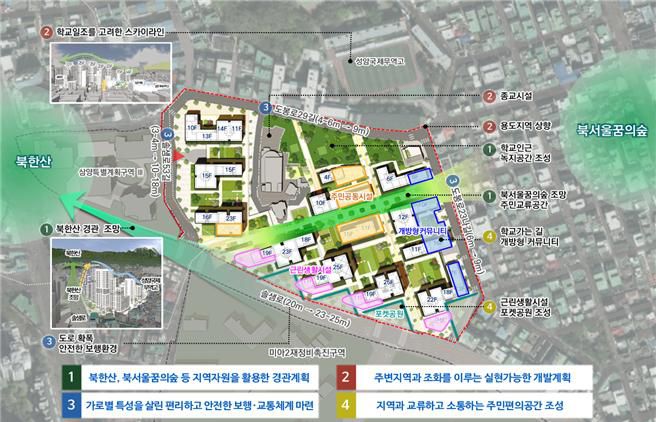 먼저 대상지 남측 솔샘로에서는 북한산이 한눈에 들어오게 하고, 북서울꿈의숲과 성암국제무역고등학교 등이 인접한 특성을 고려해 교육과 자연 자원을 유기적으로 연계할 수 있는 녹지공간을 계획했다.
