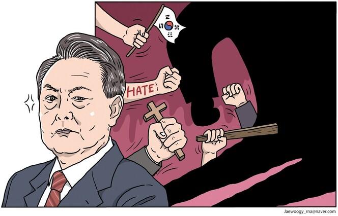 지난 몇달간 우리는 이중의 폭력을 아주 가까이서 경험했다. 그 하나는 위로부터의 국가폭력, 즉 친위 쿠데타에 의한 민주주의 폐지 시도였다. 우리는 헌법재판소 결정문과 더불어 계엄사령부 포고문, 즉 실패한 계엄 통치 계획서를 꼼꼼히 읽어야 한다. 국회, 정당, 노조, 쟁의, 집회결사, 언론출판의 자유가 모두 폐지되고 ‘처단’의 대상이 되는 세상이 눈앞의 현실로 다가와 있었다. 우리가 겪은 또 다른 폭력은 아래로부터의 폭력, 즉 극우 사회세력의 증오와 민주헌정에 대한 공격이다. ‘빨갱이’, ‘종북’, ‘좌파’, ‘공산주의자’, ‘중국인’, ‘동성애자’, ‘페미니스트’로 낙인찍힌 사람들을 ‘밟아’, ‘죽여’, ‘처단’하자는 구호에 수만 군중이 열광했다. 평범한 대중이 하나님, 애국, 자유의 이름으로 인간에 대한 절멸의 선동에 동참했다. 이 같은 이중의 폭력이 만나면 파시즘이 된다. 이 폭력들은 잠시 나타났다 소멸하는 일시적 현상이 아니라, 12·3 이전에 오랜 세월에 걸쳐 구축됐고 12·3 이후에도 오랫동안 존속할 조직과 집단, 언어, 이데올로기의 구조를 갖고 있다.