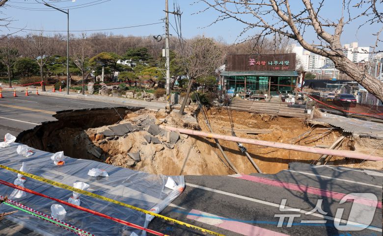 서울 강동구 명일동 대명초등학교 인근 사거리에 발생한 싱크홀(땅 꺼짐) 사고 현장 모습. 2025.3.31/뉴스1 ⓒ News1 김성진 기자 |
