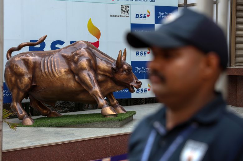 인도 뭄바이의 ‘봄베이증권거래소(BSE)’ 앞세 세워진 황소 동상과 이를 지키는 경비원의 모습 [EPA]
