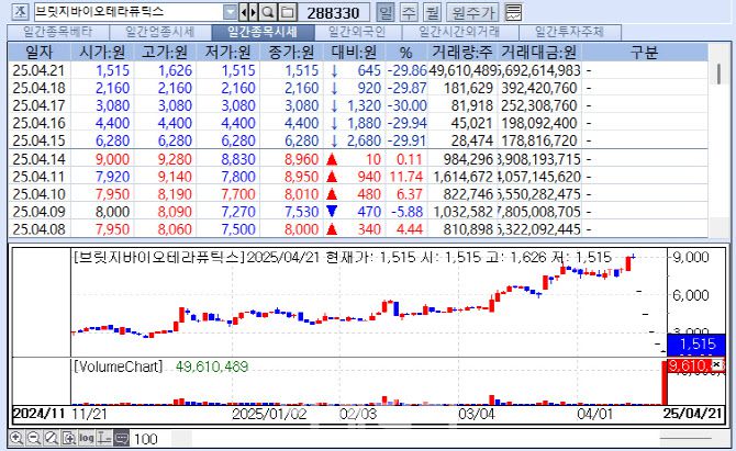 5영업일 하한가 브릿지바이오테라퓨틱스