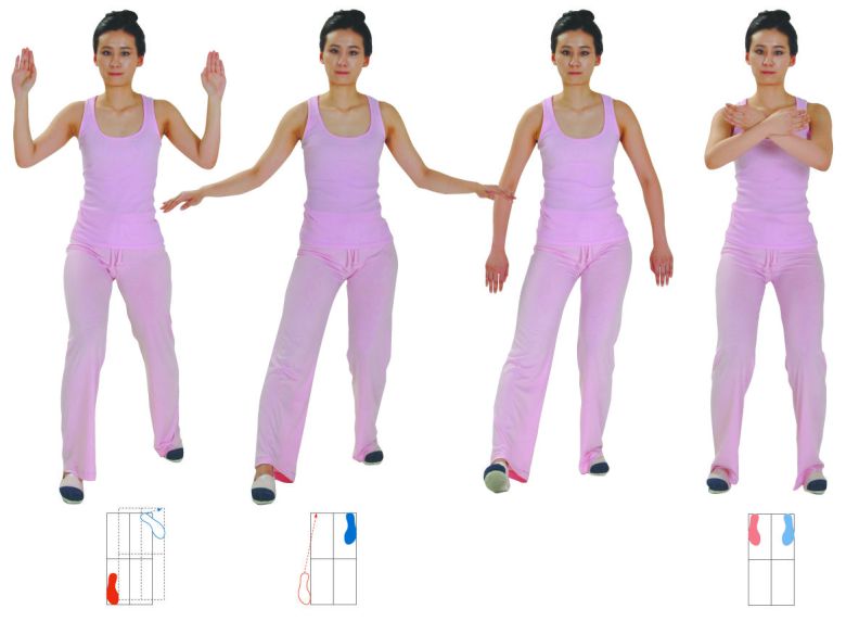 4. 오른발을 뒤로 옮겨 왼발과 어깨 너비로 평행이 되게 딛는다. 동시에 양팔을 가슴 앞으로 들어올려 X자가 되게 하는데 왼손이 안쪽, 오른손이 바깥쪽에 있게 한다.