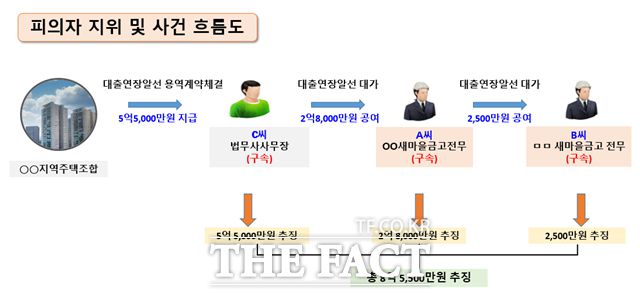 A·B·C씨는 지난 2023년 해당 조합이 요청한 대출 연장을 알선해준 뒤 그 대가로 5억5000만 원을 받아 나눠가진 혐의를 받는다.