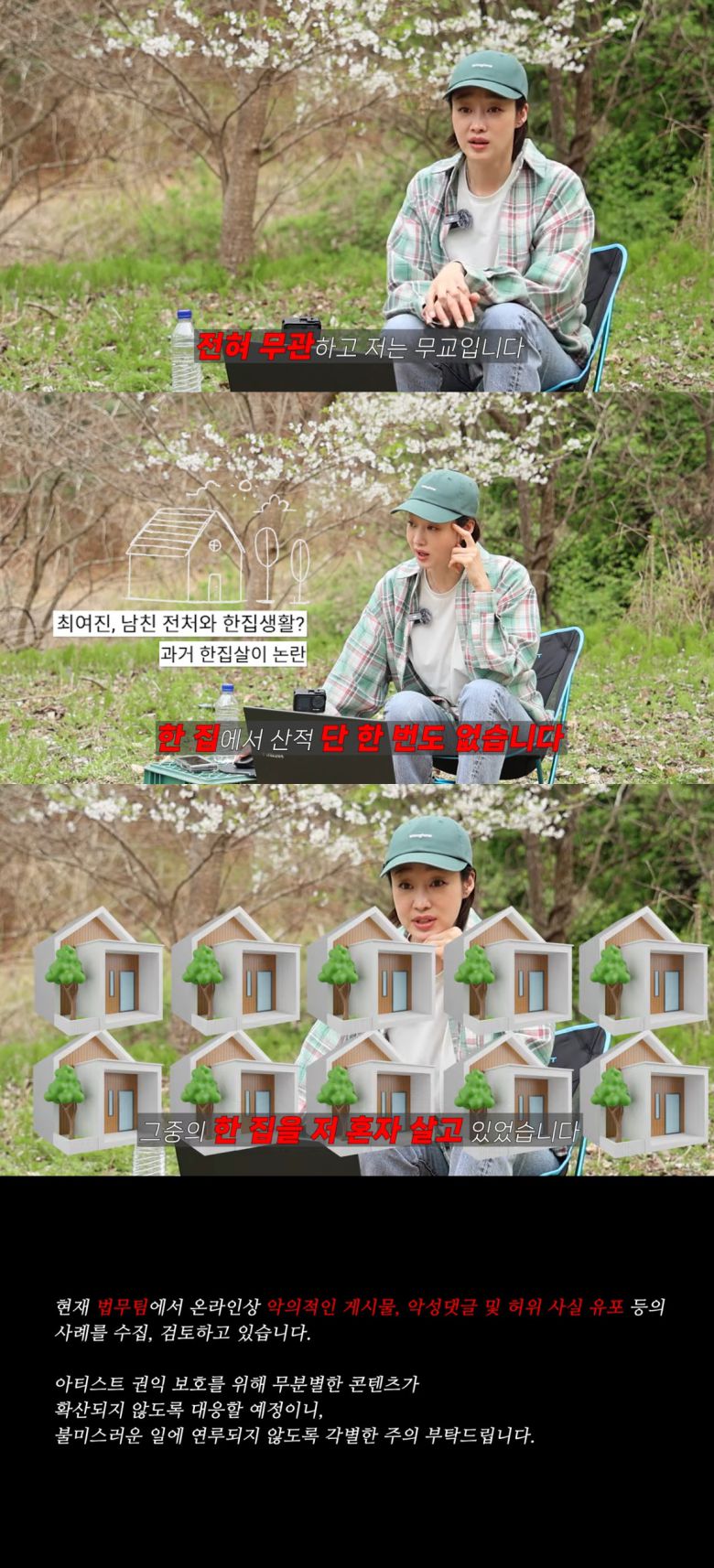 끝으로 최여진은 "선을 넘어도 너무 넘었다"며 "더 이상 억측, 루머, 소설 안 된다. 오늘부로는 멈추시고 영상, 댓글 내려 달라"라고 강력히 요청했다.
