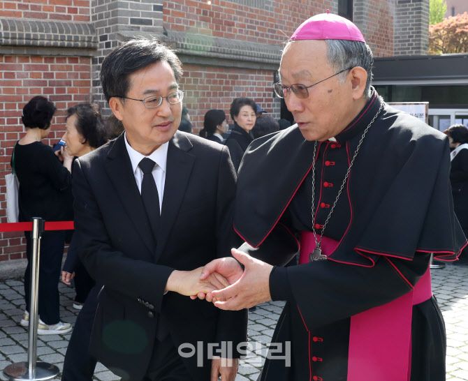 [이데일리 김태형 기자] 김동연 더불어민주당 대선 경선 후보가 23일 오전 서울 중구 명동대성당 지하성당에 마련된 故 프란치스코 교황 분향소 앞에서 구요비 천주교 서울대교구 총대리주교와 인사를 나누고 있다.