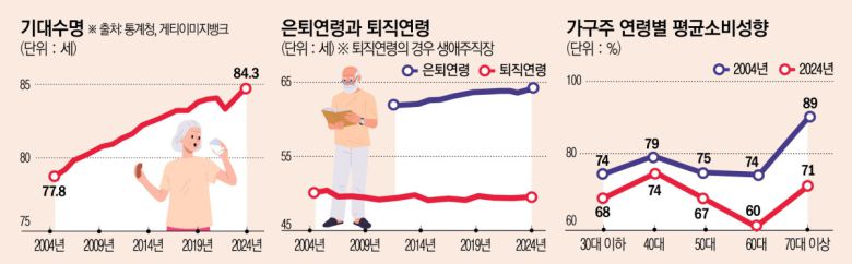 보고서에 따르면 2004~2024년 연평균 민간소비 증가율은 3.0%로 연평균 국내총생산(GDP) 성장률(4.1%)을 밑돌았다. 이는 소비성향(민간소비/GDP) 하락을 의미한다. 이러한 가운데 기대수명은 2000년대 이후 고령층 사망률이 개선되면서 같은 기간 77.8세에서 84.3세까지 6.5세 올랐다. 반면 같은 기간 은퇴연령(가구주 은퇴가구 평균연령)은 60대 초반, 생애주직장 퇴직연령(55~64세 취업경험자가 최장 근무한 일자리를 그만둔 평균연령)은 50세 수준을 유지했다.