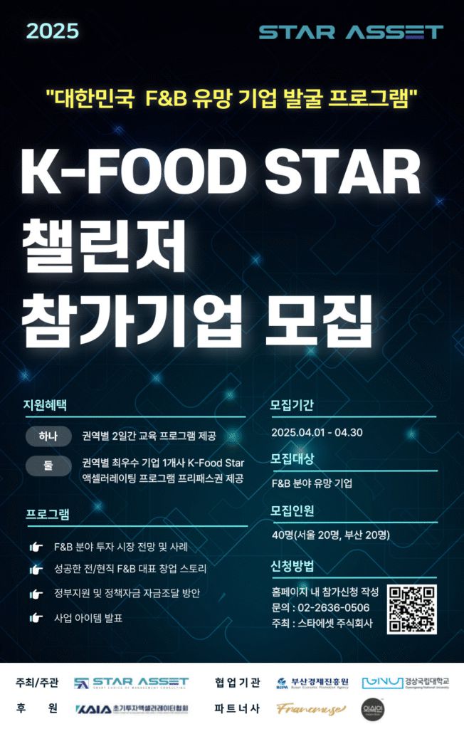 F&B 전문 경영 자문 및 액셀러레이팅 기업인 스타에셋이 차세대 기업을 찾기 위해 'K-Food Star 챌린저 프로그램' 참가 기업을 연장 모집한다.