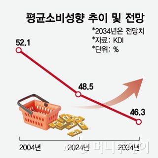 당장은 평균소비성향 하락세가 이어질 것으로 예상되는 만큼 민간소비 감소세는 이어질 전망이다. KDI는 올해부터 2040년까지 실질 민간소비 증가율이 연평균 0.06%p씩 하락할 것으로 분석했다.