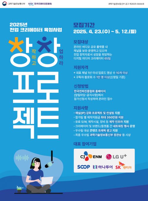 한국전파진흥협회는 과학기술정보통신부와 함께 성장단계의 크리에이터를 대상으로 ‘2025년 전업 크리에이터 육성 사업(부제: 창창 프로젝트)’을 추진한다.
