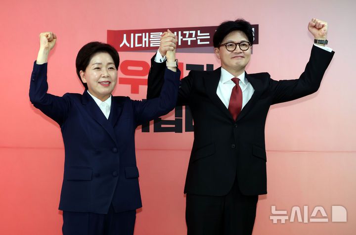 [서울=뉴시스] 조성봉 기자 = 한동훈 제21대 대통령 선거 국민의힘 경선 후보와 1차 경선에서 컷오프된 양향자(왼쪽) 후보가 23일 오후 서울 여의도 캠프 사무실에서 손을 잡고 기념촬영을 하고 있다. 이날 양 후보는 한동훈 후보 지지를 선언했다. 2025.04.23.suncho21@newsis.com