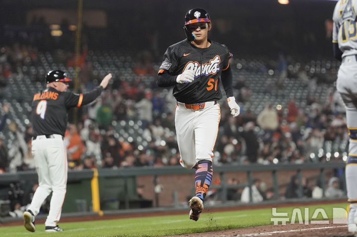 [샌프란시스코=AP/뉴시스] 샌프란시스코 자이언츠의 이정후가 23일(한국 시간) 미국 캘리포니아주 샌프란시스코의 오라클 파크에서 벌어진 2025 메이저리그(MLB) 밀워키 브루어스와의 경기에서 8회말 득점을 올리고 있다. 2025.04.23