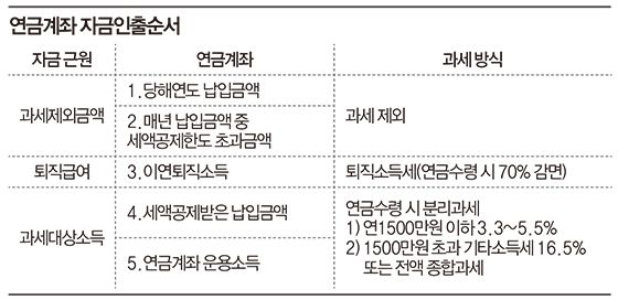 매년 납입금액 중 세액공제 한도초과금액은 비과세로 인출 1순위다. 그다음 2순위는 퇴직금을 받은 이연퇴직소득이다. 연금으로 수령할 경우엔 퇴직소득세의 30%(실제 수령 연차 10년 미만)가 줄어든다. 연금이 아닌 일시금으로 받을 때는 퇴직소득세를 낸다. 3순위는 세액공제를 받은 납입금과 연금계좌의 운용소득이다. 앞에서 설명한 것과 같이 연 1500만원 이하로 인출할 경우 3.3~5.5%의 연금소득세로 분리과세된다.