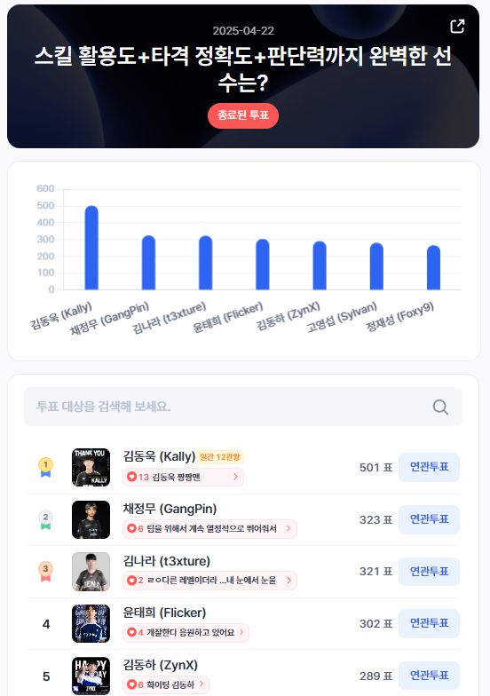 3위 김나라(t3xture)는 321표를 기록했고, 4위 윤태희(Flicker)는 302표, 5위 김동하(ZynX)는 289표를 얻었다.