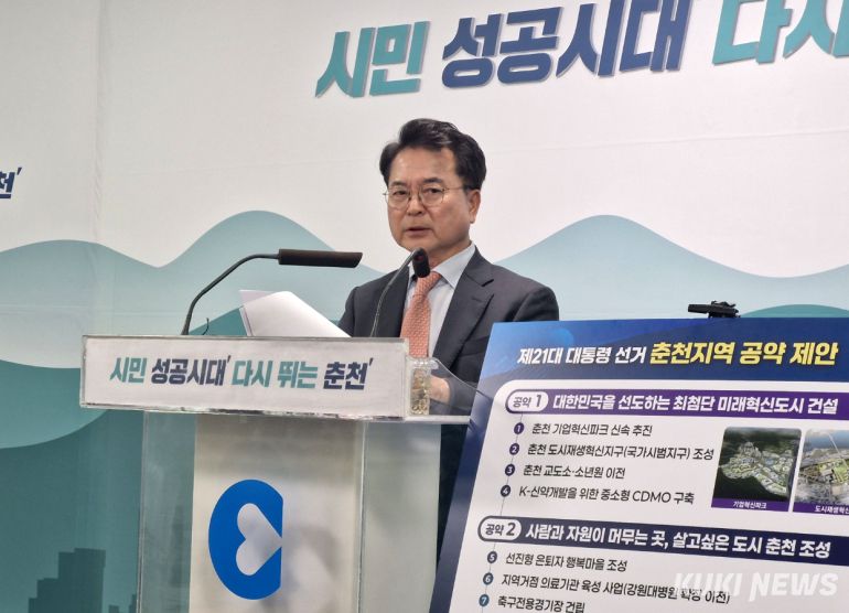 제21대 대통령 선거를 앞두고 육동한 춘천시장이 23일 춘천시청 브리핑룸에서 기자회견을 열고 4대 분야, 13개 세부사업으로 구성된 지역 공약을 차기 정부와 정치권에 제안했다.