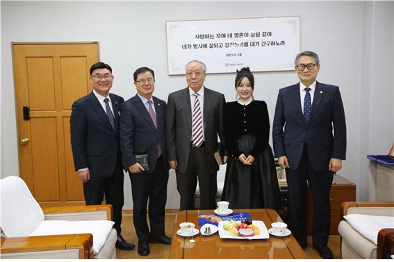 지난 3월 탈북방송인 정유나씨가 순복음노원교회 금요 철야예배에 참석해 신앙 간증을 했다. 왼쪽부터 서옥인 목사, 이흥섭 장로, 유재필 원로목사,정유나씨, 이기선 장로가 간증에 앞서 기념촬영을 하고 있다./부두완 기자 |