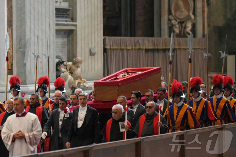 (바티칸 AFP=뉴스1) 최종일 선임기자 = 23일(현지시간) 바티칸에서 프란치스코 교황의 관이 성베드로 대성당 내부로 옮겨지고 있다. 관은 개방돼 있다. 이날 일반 조문이 시작된다. 2025.04.23 ⓒ AFP=뉴스1 Copyright ⓒ 뉴스1. All rights reserved. 무단 전재 및 재배포, AI학습 이용 금지.이 기사의 카테고리는 언론사의 분류를 따릅니다.0공유하기
