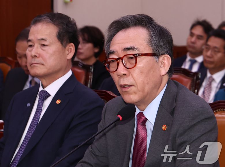 조태열 외교부 장관이 23일 오후 서울 여의도 국회에서 열린 외교통일위원회의 전체회의에서 2025년도 제1회 추가경정예산안(정부) 관련 의원 질의에 답변하고 있다. 왼쪽은 김영호 통일부 장관. 2025.4.23/뉴스1 ⓒ News1 김민지 기자 |