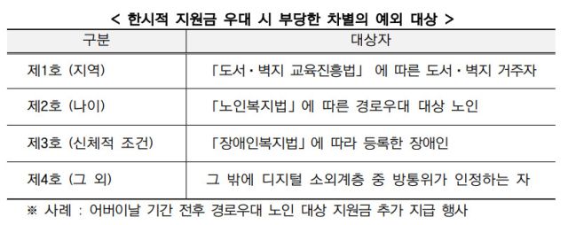 부당한 지원금 차별 방지를 위해 동일한 가입유형·요금제·단말기 조건에서 ▲가입자 주소 ▲나이 ▲장애 등을 이유로 서로 다른 지원금을 지급하는 행위는 금지된다. 다만, 노인, 장애인 등 디지털 소외계층을 대상으로 한시적으로 지원금을 우대하는 경우는 예외로 둔다.
